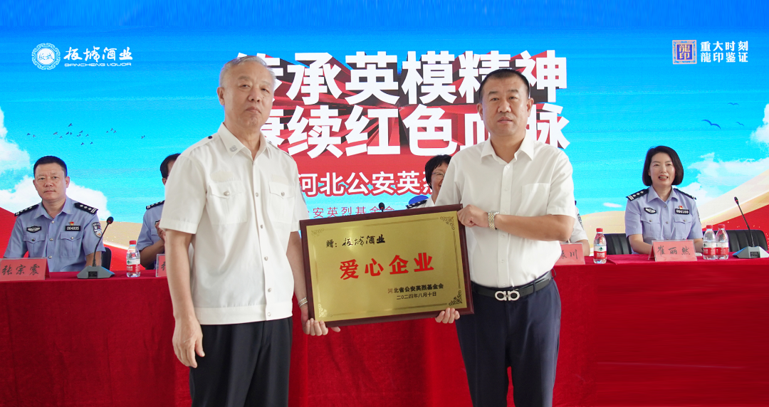 基于板城酒業積極踐行社會責任,舉辦或助力多項暖警公益活動,河北省公安英烈基金會理事長吳鴻恩向板城酒業授牌,以感謝企業在警企共建等愛警公益事業上所做出的貢獻。