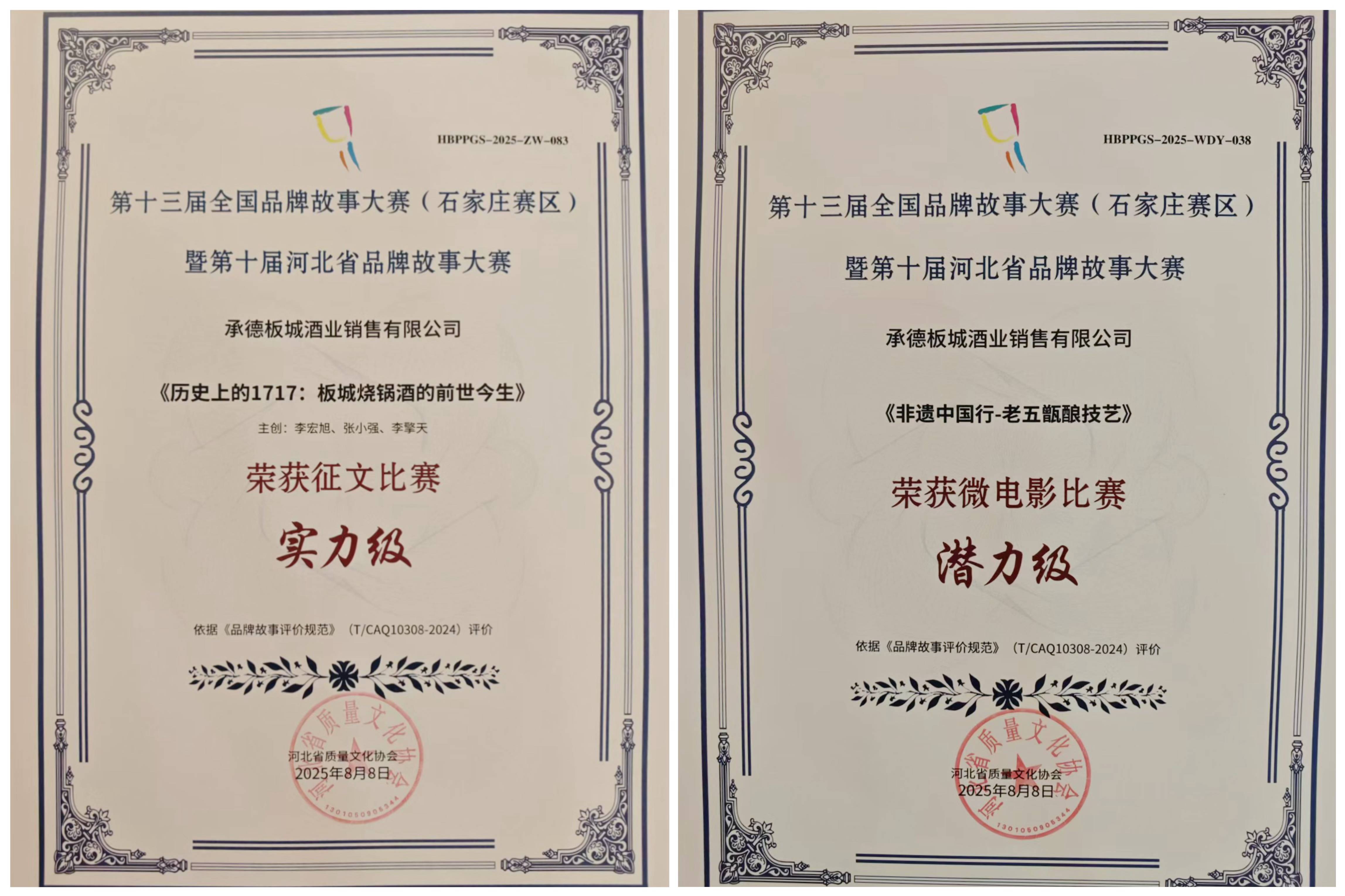 板城酒業憑借深厚的歷史底蘊與創新的文化表達,一舉斬獲雙項大獎——《歷史上的1717:板城燒鍋酒的前世今生》榮獲征文比賽實力級獎項,《非遺中國行——老五甑釀造技藝》榮獲微電影比賽潛力級獎項!這不僅是對板城酒業品牌敘事能力的肯定,更是對“老五甑”非遺技藝與三百年匠心傳承的高度贊譽。