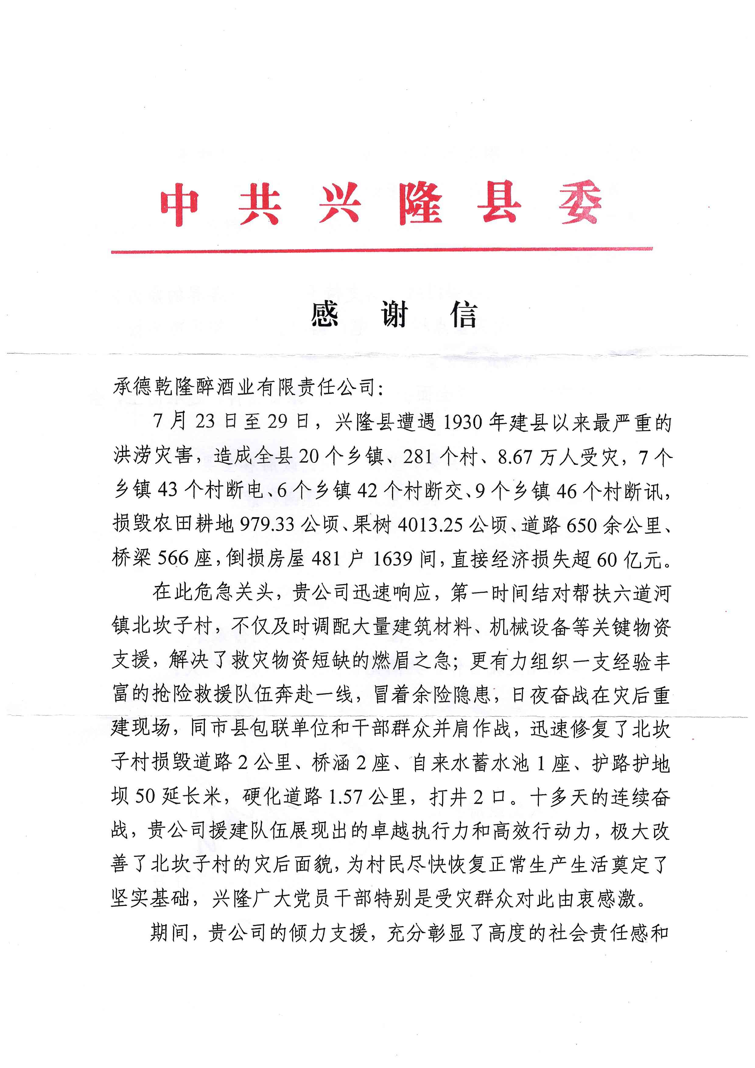 近日,板城酒業(yè)(承德乾隆醉酒業(yè)有限責(zé)任公司)收到中共興隆縣委發(fā)出的感謝信,信中對板城酒業(yè)在今年7月興隆縣特大洪澇災(zāi)害中的緊急馳援和傾力相助表示高度贊譽和衷心感謝。