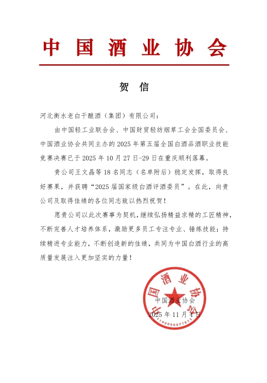 中國酒業協會發來賀信,在恭祝企業取得良好成績的同時,希望以此次賽事為契機,繼續弘揚精益求精的工匠精神,不斷完善企業人才培育體系,持續增進業務能力。